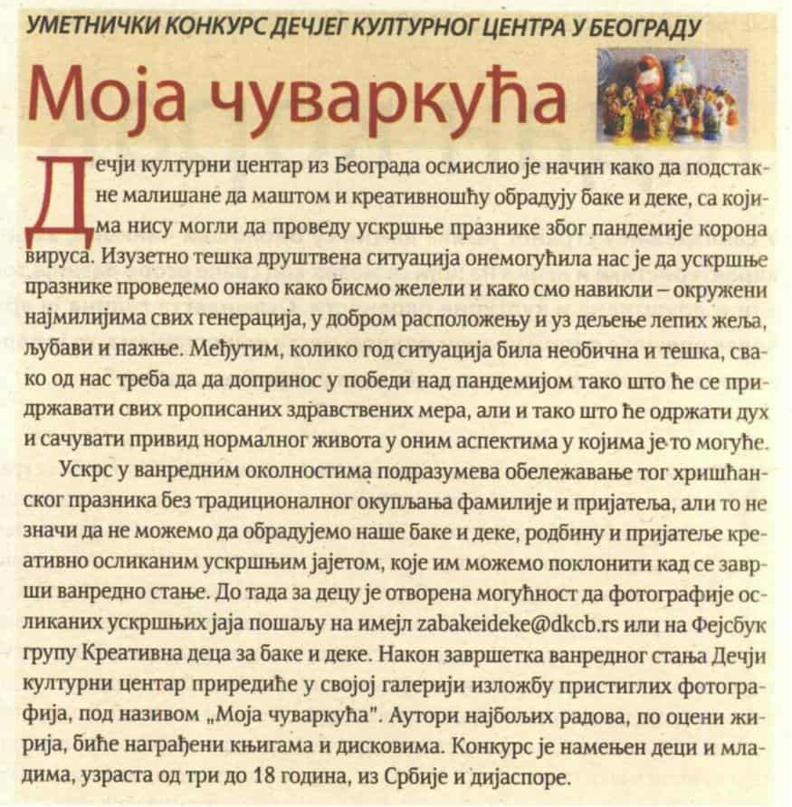 Прошломесецечни број стручног часописа за образовну делатност ПРОСВЕТНИ ПРЕГЛЕД доноси два текста о активностима Дечјег културног центра Београд. Ументнички конкурс „МОЈА ЧУВАРКУЋА“ је био тема посебног чланка, док је уметнички конкурс „НЕМА ФРКЕ УЗ УНУКЕ“ поменут у чланку о избору наставног садржаја за Посебни васпитно-образовни програм рада на српском језику у иностранству.