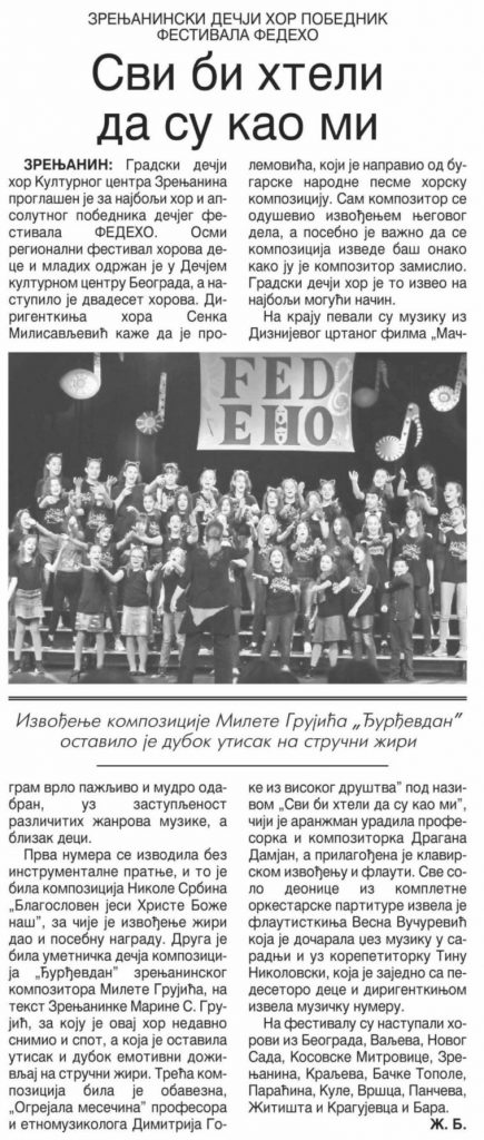 ДНЕВНИК – Зрењанински ДЕЧЈИ ХОР победник фестивала ФЕДЕХО Posted on 20/05/201920/05/2019 Posted in Press Clipping and tagged fedeho, hor, федехо, хор.