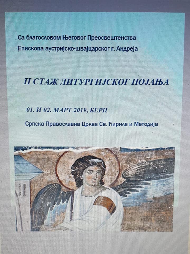 У Швајцарској, у граду Белпу, одржан је ДРУГИ СТАЖ ЛИТУРГИЈСКОЈ ПОЈАЊА за диригенте и црквене појце, са благословом Његовог Преосвештенства Епископа Андреја, на којем је један од предавача и диригената на Архијиерејској Литургији 2. марта била и диригентица нашег хора Невена Ивановић. Семинар, на челу са организатором Нином Софронскки, окупио је диригенте и појце из Трста, Цириха, Лозане и Београда, и од предавачи су још били и Ана Каиро и Урош Лалицки. Дивна размена искустава огледала се у сваком заједничком појању и тренутку.