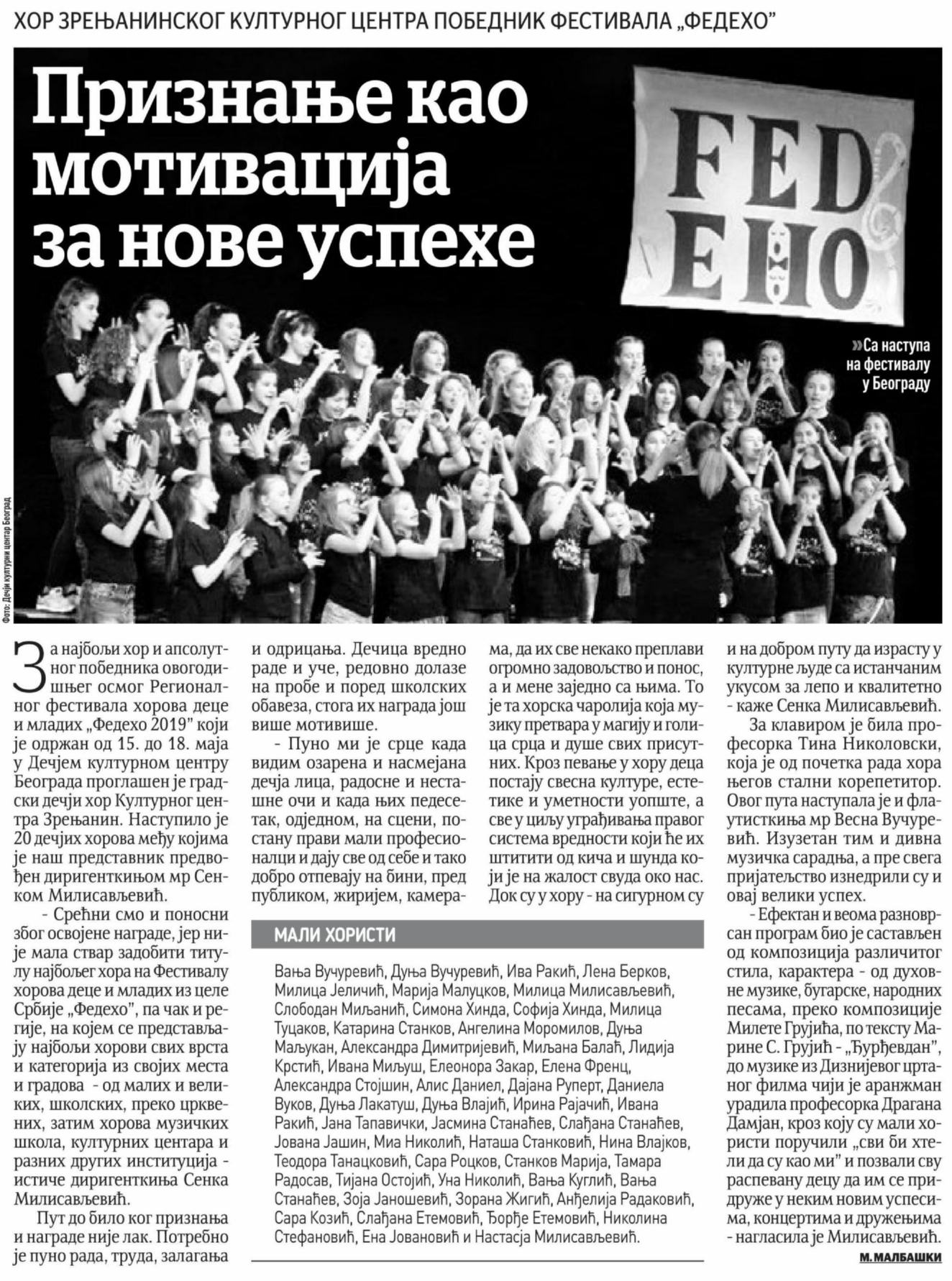 ЗРЕЊАНИН – Признање на фестивалу ФЕДЕХО Posted on 07/06/201907/06/2019 Posted in Press Clipping and tagged fedeho, hor, федехо, хор.