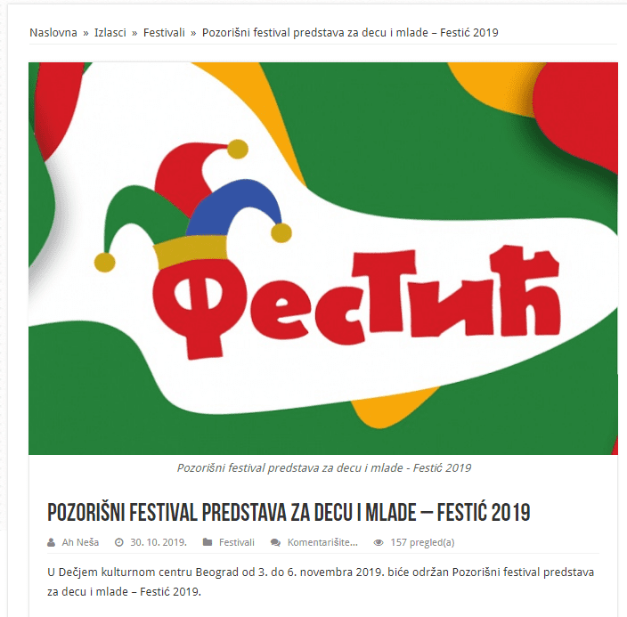 Интернет медији о позоришном фестивалу за децу ФЕСТИЋ 2019 Posted on 31/10/201905/03/2020 БЛИЦ ДАН У БЕОГРАДУ Posted in Press Clipping.