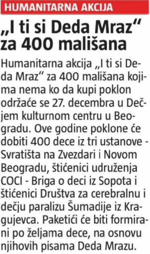 Информер – И ти си Деда Мраз Posted on 14/12/201514/12/2015 Хуманитарна акција за 400 малишана којима нема ко да купи поклон одржаће се 27. децембра у ДКЦБ. Posted in Press Clipping.
