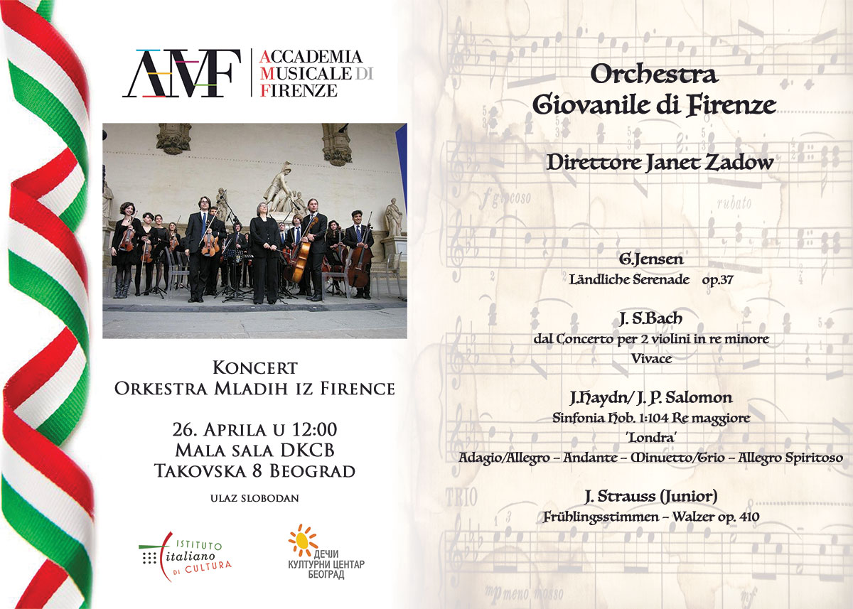 КОНЦЕРТ ОРКЕТСТРА МЛАДИХ ИЗ ФИРЕНЦЕ 26. април у 12:00h Posted on 13/04/201713/04/2017 Posted in Концертни програм and tagged dkcb, koncert, ДКЦБ, концерт.