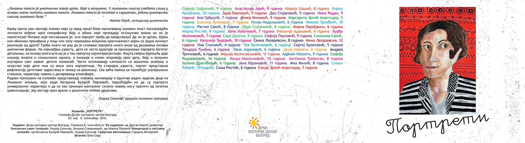 Полазници Ликовног атељеа Дечјег културног центра Београд кога води Катарина Булајић Павловић, окупили су се на изложби својих ликовних радова. Портерте су сликала деца узраста од 4 до 14 година.