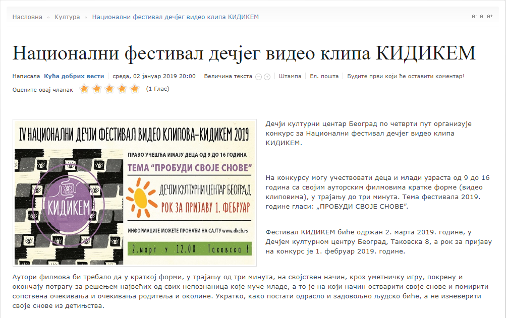 О Националном фестивалу дечјег видео килпа КИДИКЕМ Posted on 09/01/201907/12/2022 Posted in Press Clipping, КИДИКЕМ and tagged dkcb, kidikem, ДКЦБ, кидикем.