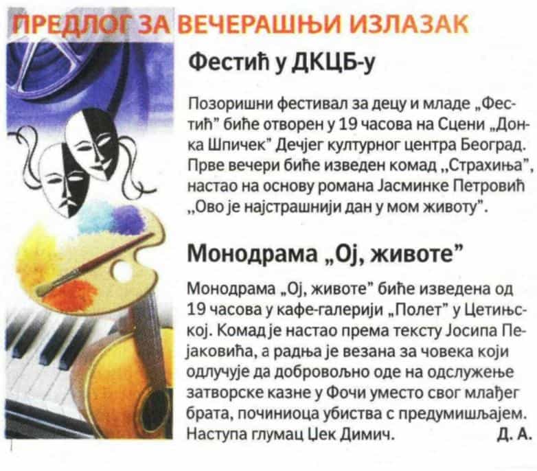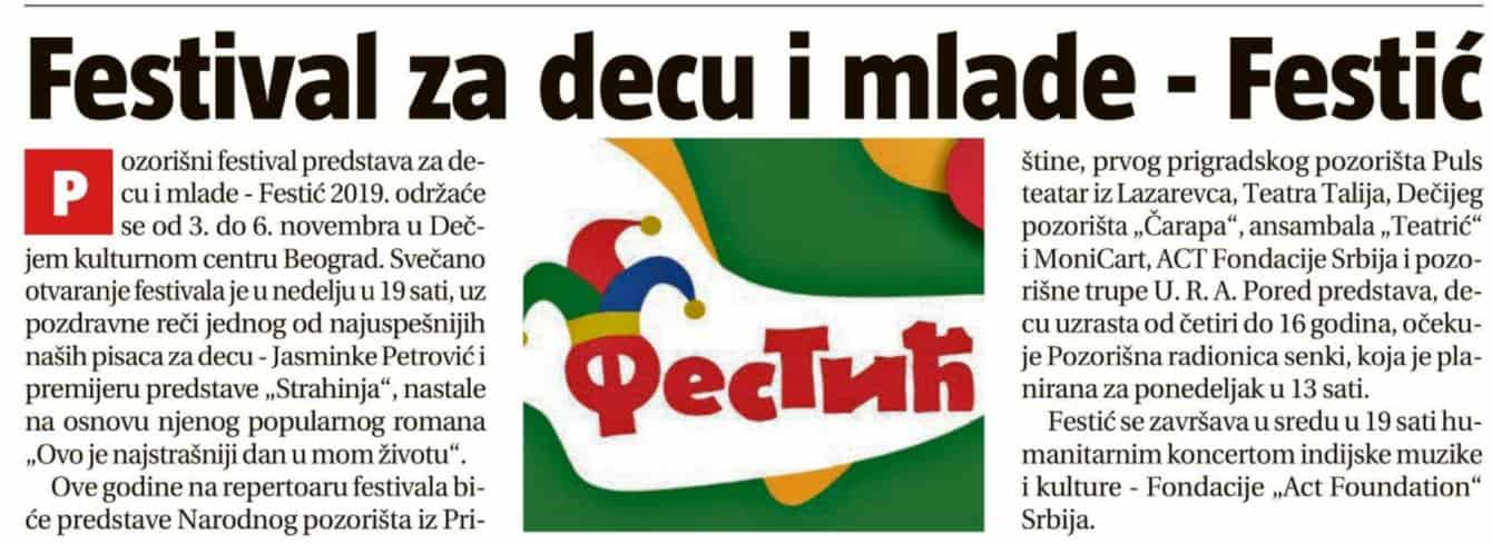 ПОЛИТИКА и ИНФОРМЕР – Отварање „Фестића”, фестивала за децу и младе Posted on 04/11/201904/11/2019 Posted in Press Clipping and tagged festić, фестић.