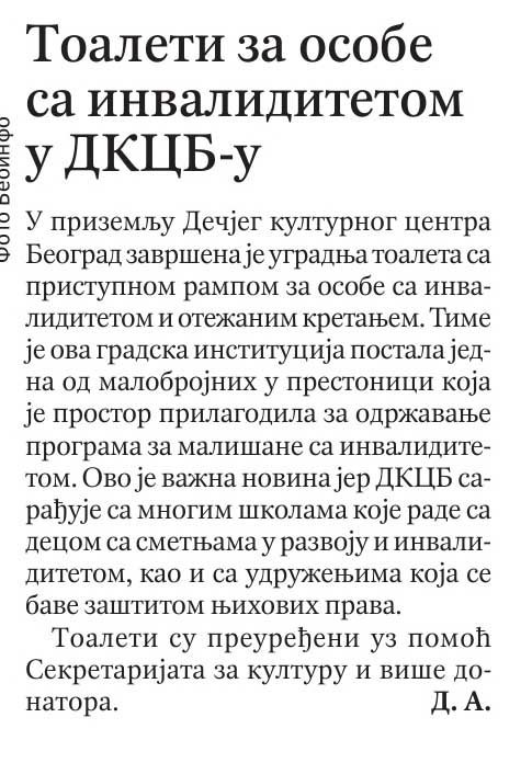 У приземљу Дечјег културног центра Београд завршена је уградња тоалета са приступном рампом за особе са инвалидитетом.