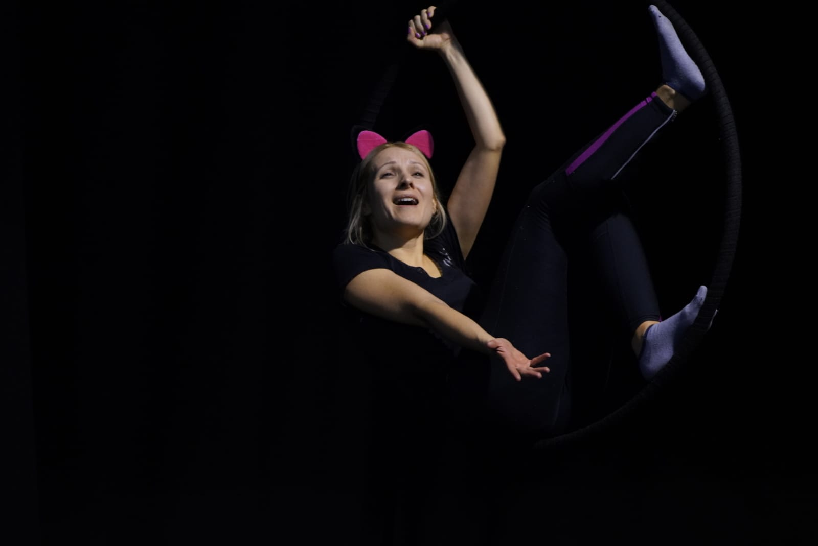 Као доминантан реквизит користи се такозвани ваздушни обруч, који може да се подиже и спушта, њише и ротира, прескаче, обрће и виси наглавачке. На тај начин се отвара неизмеран простор телесног израза примереног дечјем сензибилитету. Једна глумица на сцени тумачи три лика : мачку, миша и наратора. Деца се упознају са једном потпуно несвакидашњом формом за дечије позориште : монодрамом са елементима акробатике.