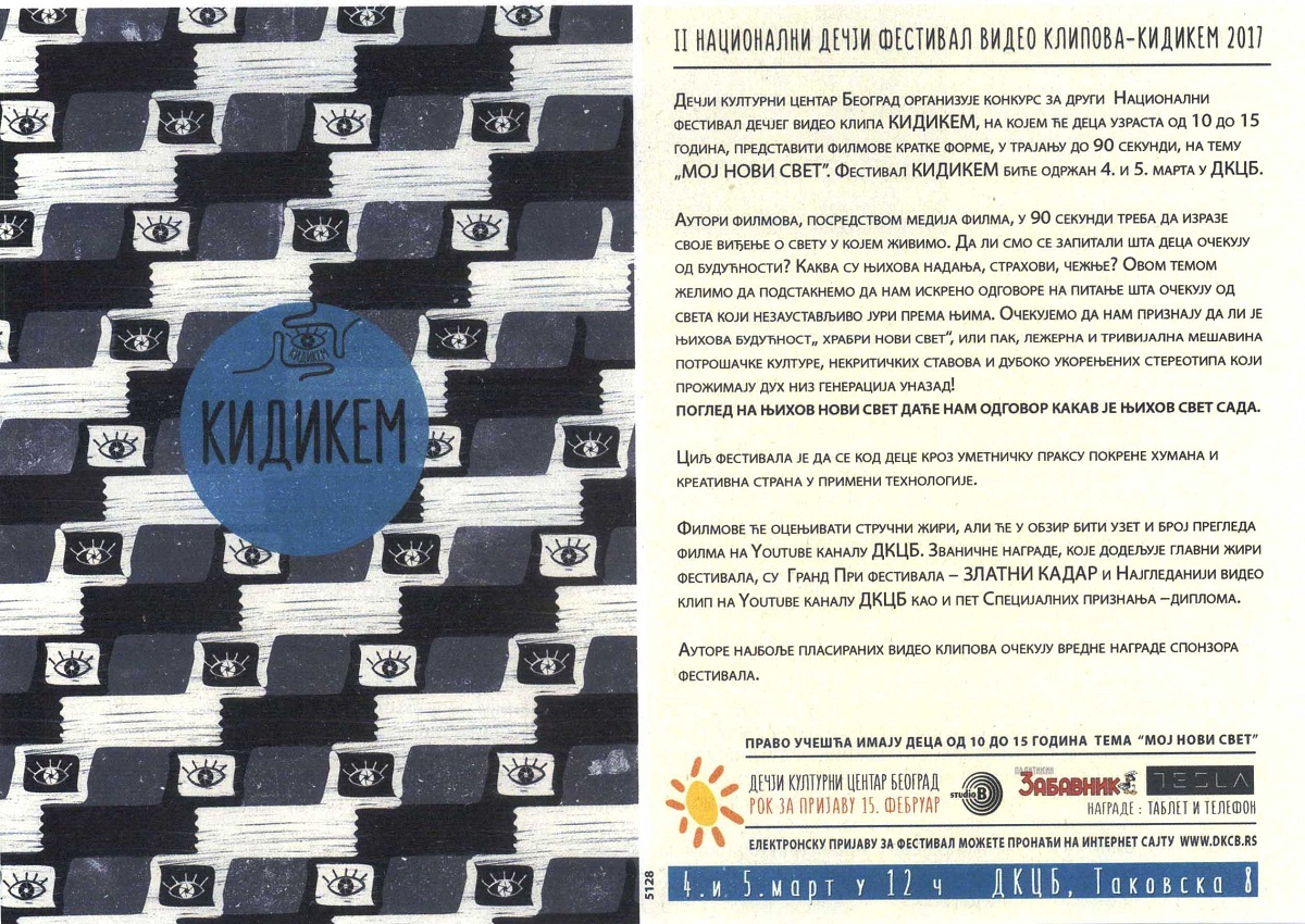 Пријави свој видео клип и буди учесник Кидикема! Posted on 23/01/201707/12/2022 Posted in Press Clipping, КИДИКЕМ and tagged dkcb, kidikem 2017, ДКЦБ, кидикем 2017.