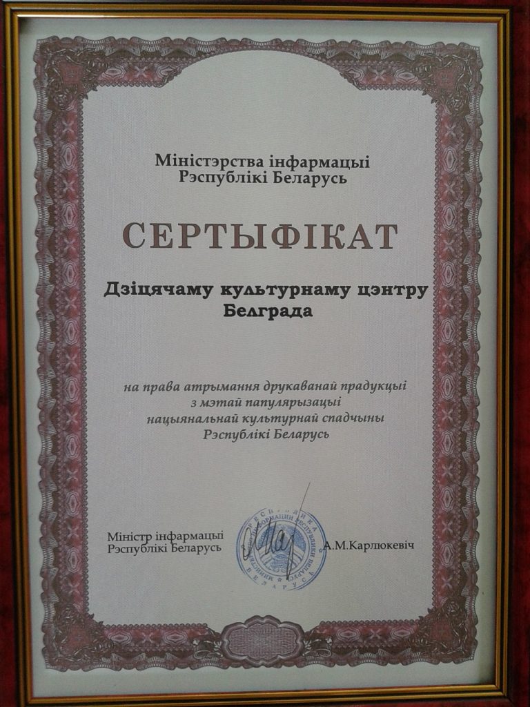 Белоруска делегација, која је ове године гостовала на Сајму књига у Београду уручила је вредан Сертификат Дечјем културном центру Београд. Сертификат потписује Министар културе и информација Републике Белорусије – Александар Карљукевич, на име: „Права преузимања штампане продукције са циљем популаризације националног културног наслеђа Републике Белорусије.“ Делегација је уз Сертификат поклонила Дечјем културном центру и стотинак књига за децу и одрасле.