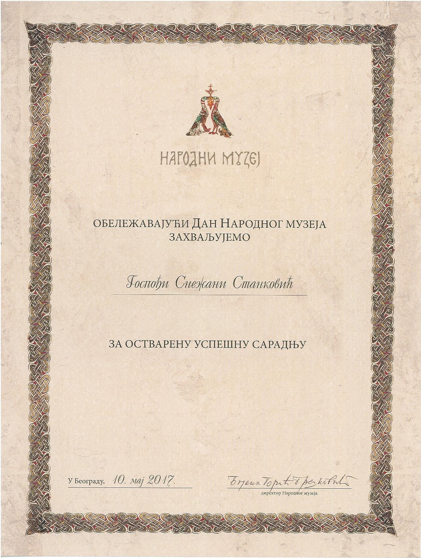 Поводом Дана Народног музеја у Београду, на свечаности којом је обележена годишњица од оснивања настарије и највеће музејске куће у Србији, 10. маја 2017. у дворишту Музеја Вука и Доситеја Бојана Борић Брешковић, директорка Народног музеја, уручила је захвалнице и признања запосленима, сарадницима и пријатељима музеја. Вишедеценијску успешну сарадњу ДКЦБ и Народног музеја, у последње две декаде, обогатили су и учврстили уредници и сарадници Центра за музејску дидактику ДКЦБ и кустоси и стручни сарадници Одељења за едукацију Народног музеја. Није изостала ни награда – Захвалница за остварену успешну сарадњу додељена је Снежани Станковић, уредници програма Центра за музејску дидактику.