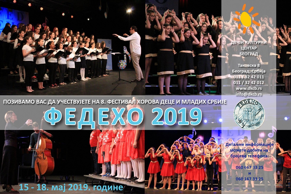 Дечји културни центар Београд има част да Вас позове да учествујете на Осмом музичком Фестивалу хорова деце и младих ФЕДЕХО који ће се одржати од 15. до 17. маја 2019. године, а ревија победника 18. маја. Циљ фестивала је афирмисање дечје хорске музике, сценског музичког извођења и популарисање хорске музике као део нашег културног наслеђа.