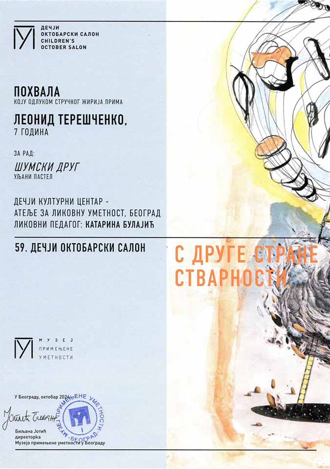 Леонид Љоња Терешченко, 7 година, освојио је похвалу за рад “Шумски друг” на овогодишњем Дечјем октобарском салону који већ шест деценија организује Музеј примењене уметности. На изложби су изложени и радови Марије Предраговић и Петре Симић, такође полазница Ликовног атељеа Дечјег културног центра који води мр Катарина Булајић.