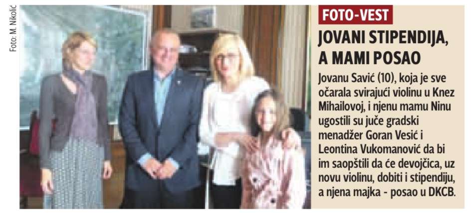 Талентована девојчица Јована Савић (10) која је задивила Београђане и госте наше престонице, свирајући на виолини у Кнез Михаиловој улици и скупљајући новац за бољу виолину, упознала је данас градског менаџера Горана Весића који јој је помогао око набавке нове виолине и Леонтину Вукомановић,саветника директора Дечјег културног центра.