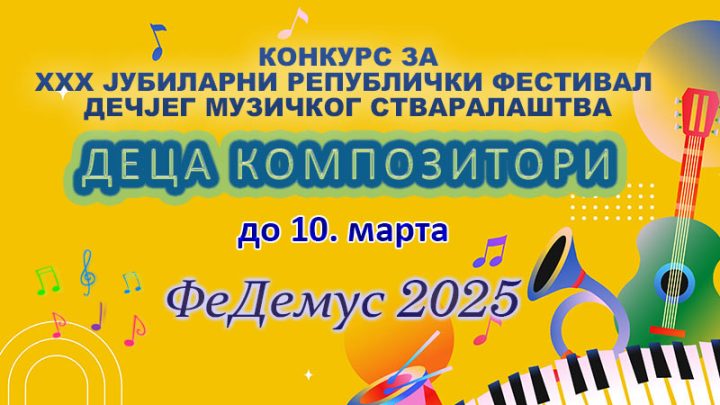 Саопштење за медије ФЕДЕМУС 2025 КОНКУРС „ДЕЦА КОМПОЗИТОРИ“ XXX Републички фестивал дечјег музичког стваралаштва Дечји културни центар Београд позива децу и младе да учествују на 30. јубиларном конкурсу „Деца композитори” Фестивала дечјег музичког стваралаштва […]