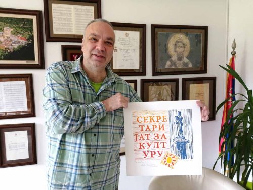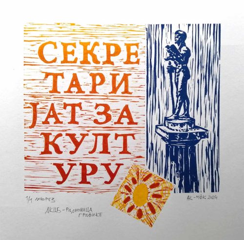 Проф. мр Драган Марић са својим тимом, уз сунчане боје ДКЦБ-а за срећно пресељење Секретаријату за културу. Поклон графика (линорез) – Радионица графике ДКЦБ – април 2024.