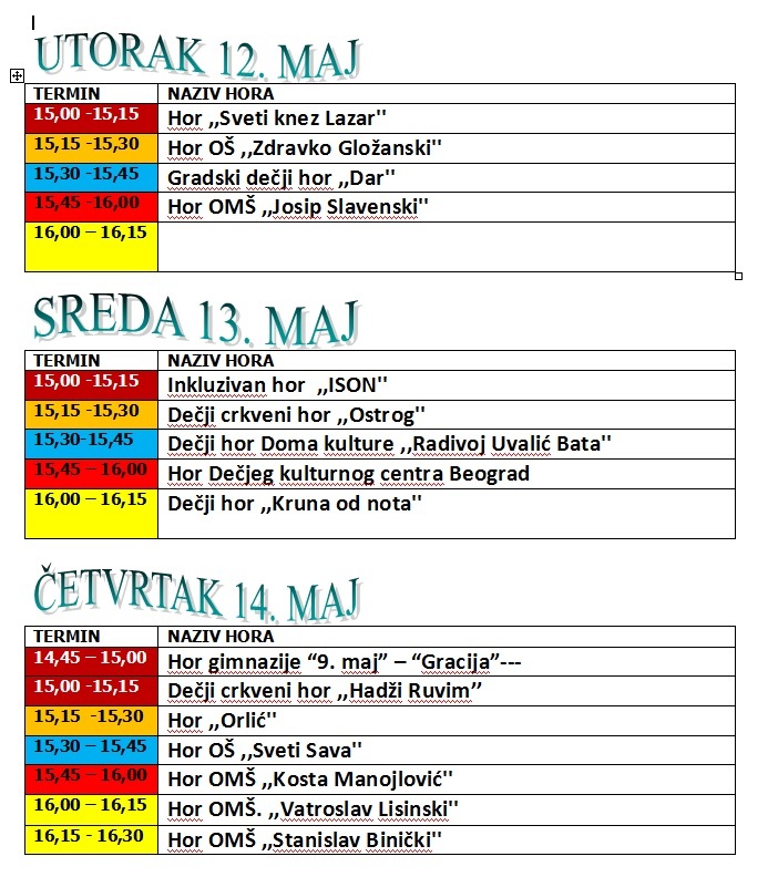 Концерти/наступи на Фестивалу ФЕДЕХО 12, 13 и 14. маја почињу у 17 сати. Сваки хор ће имати по 15-ак минута да проба тон и клавир у сали.Молим Вас да поштујете сатницу тонских проба , јер се од 16.30 сала припрема за почетак програма .