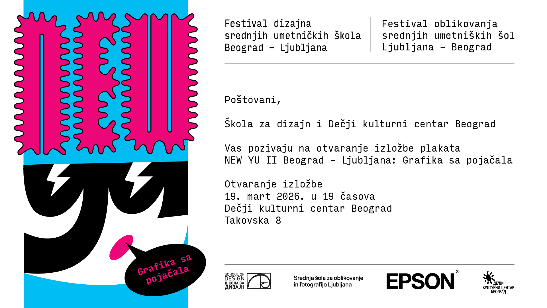 Фестивал плаката NEW YU у свом другом издању потврђује континуитет и продубљује сарадњу уметничких средњих школа – Школе за дизајн из Београда и школе из Љубљане, Srednja šola za oblikovanje in fotografijo.