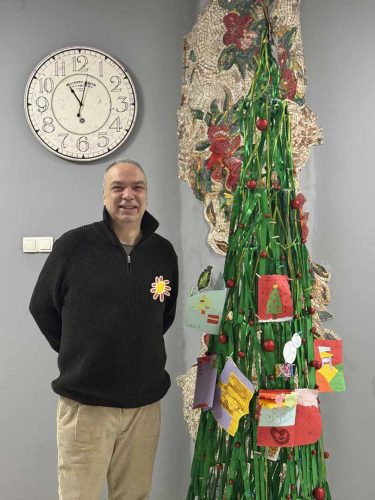 Драган Марић испред јелке на коју деца каче своје креативне честитке са жељама