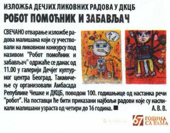 Изложба дечјих радова са ликовног конкурса „Робот помоћник и забављач“, који су организовали Амбасада Републике Чешке и Дечји културни центар Београд, биће отворена сутра у Галерији ДКЦБ поводом обележавања стогодишњице настанка речи „робот“.