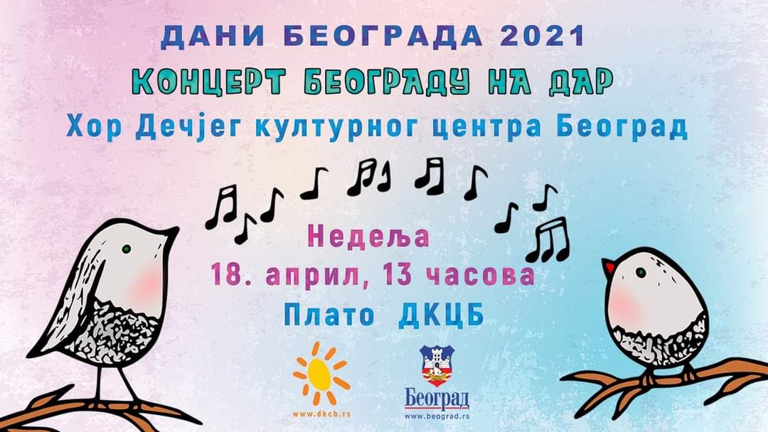 У оквиру манифестације ,,Дани Београда”, Хор ДКЦБ одржаће концерт ,,Београду на дар” у недељу 18. априла у 13 часова. Добро дошли! У случају лошег времена, концерт ће се одржати у Атријуму Дечјег културног центра Београд.