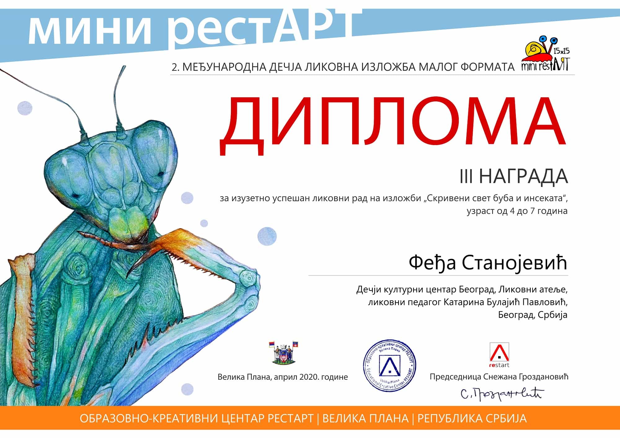 Данас је уручена медаља полазнику Ликовног атељеа Феђи Станојевићу, који је својио је трећу награду у својој категорији на 2. Међународном дечјем ликовном конкурсу Мини Рестарт “Скривени свет буба”. На конкурс је пристигло 8743 рада из 29 држава света. Честитамо Феђи и желимо му још пуно успеха.