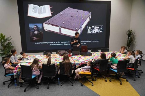 Програм се састојао од уводног предавања и креативне радионице. У уводном делу предавач Матија Марић је кроз причу прилагођену деци представио Мирослављево јеванђеље, када и где је настало, ко су били писари и илуминатори, како су тада настајале књиге (ручно, пером, на пергаменту…) и показао уживо реплику јеванђеља са орнаментина, златним словима и црвеним иницијалима.