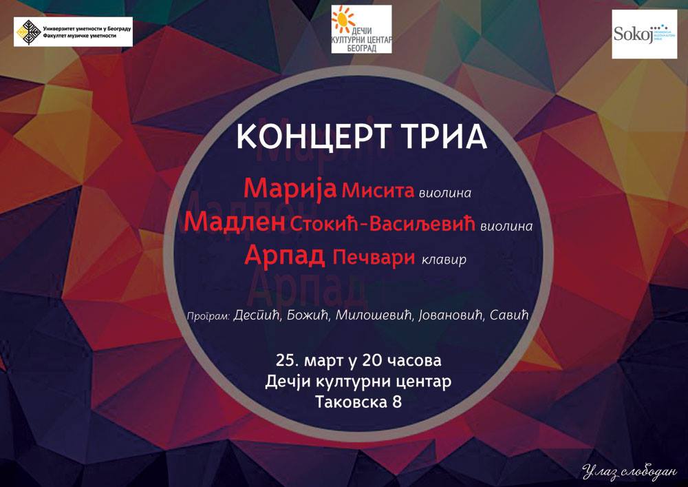 Muzička sreda, sezona 4 – Koncert tria: Marija Misita (violina), Madlen Stokić-Vasiljević (violina) i Arpad Pečvari (klavir). Program: D. Despić, S. Božić, T. Milošević, D. Jovanović, S. Savić. Dečji kulturni centar, Takovska 8