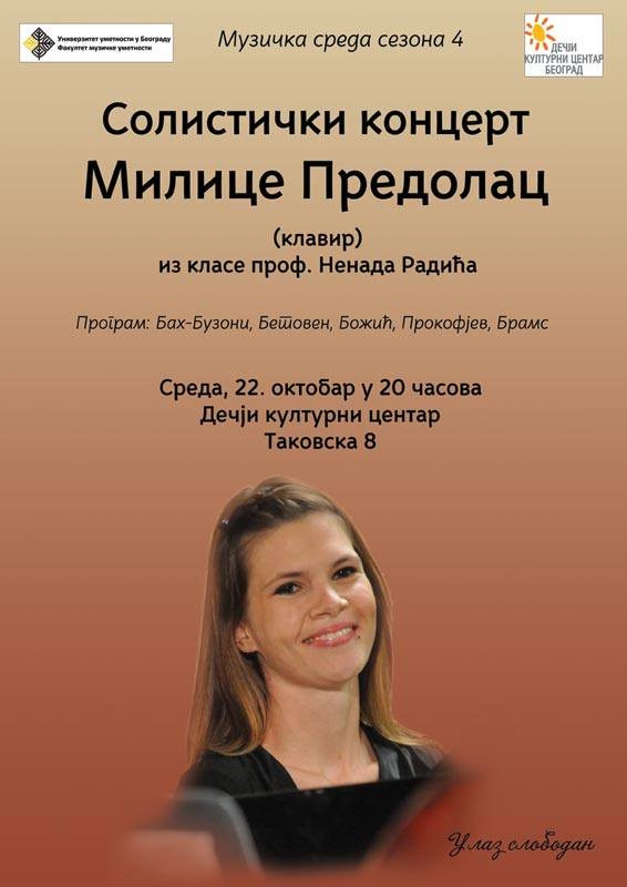 S velikim zadovoljstvom Vas pozivamo na Solistički koncert Milice Predolac (klavir) iz klase prof. Nenada Radića. Program: Bah-Buzoni, Betoven, Božić, Prokofjev, Brams Sreda, 22, oktobar u 20 časova Ulaz slobodan