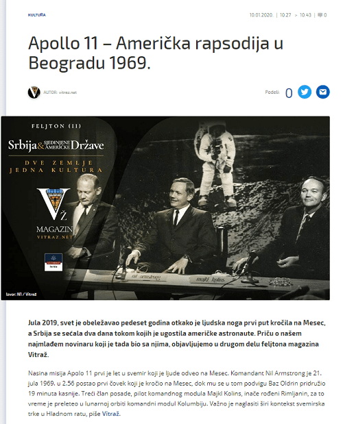 Јула 2019, свет је обележавао педесет година откако је људска нога први пут крочила на Месец, а Србија се сећала два дана током којих је угостила америчке астронауте. Дечји културни центар Београд, тадашњи Дом пионира, имао је ту част да угости светски значајну делегацију и изведе музичко-сценски програм на Великој сцени, која сада има име “Донка Шпичек”.