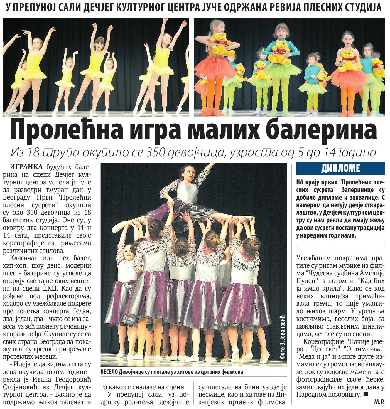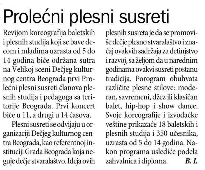 Tema priloga je bila o prolećnim plesnim susretima u Dečijem kulturnom centru. Ned, 29/03/2015 DANAS – Beograd