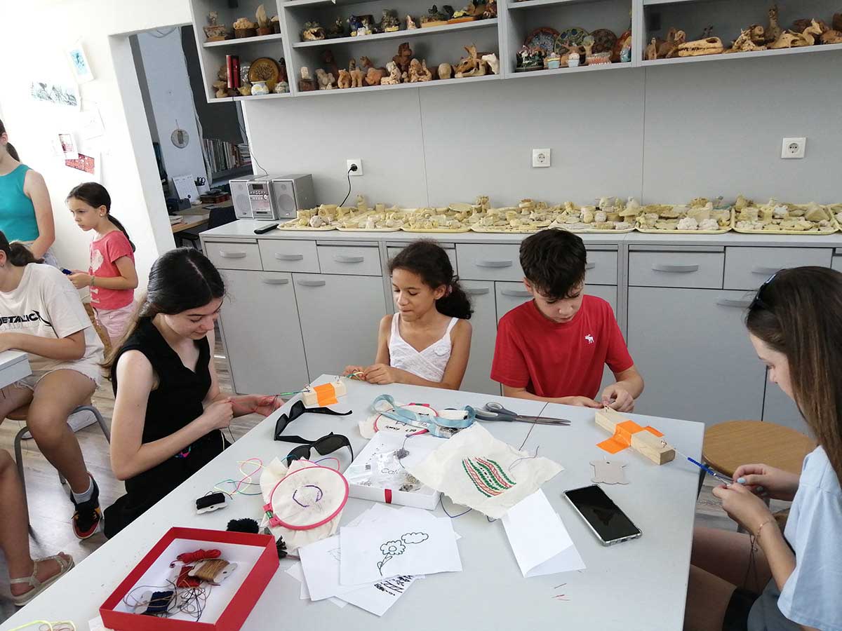 Последњег дана има нас више него првог и даље нам је једина брига хоће ће бити довољно изабране боје конца до краја веза или наруквице. Бод преко бода и нит преко нити учине да два сата дневно неприметно и опуштено тече. 20 полазника и исто толико пари вредних руку. Вешти прстићи све брже раде и велико је задовољство гледати како се вештина када су деца у питању развија у само пет дана.