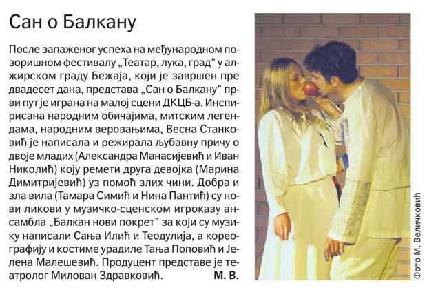 Posle zapaženog uspeha na međunarodnom pozorišnom festivalu “Teatar, luka, grad” u alžirskom gradu Bežaja, koji je završen pre dvadeset dana, predstava “San o Balkanu” prvi put je igrana na maloj sceni DKCB-a.