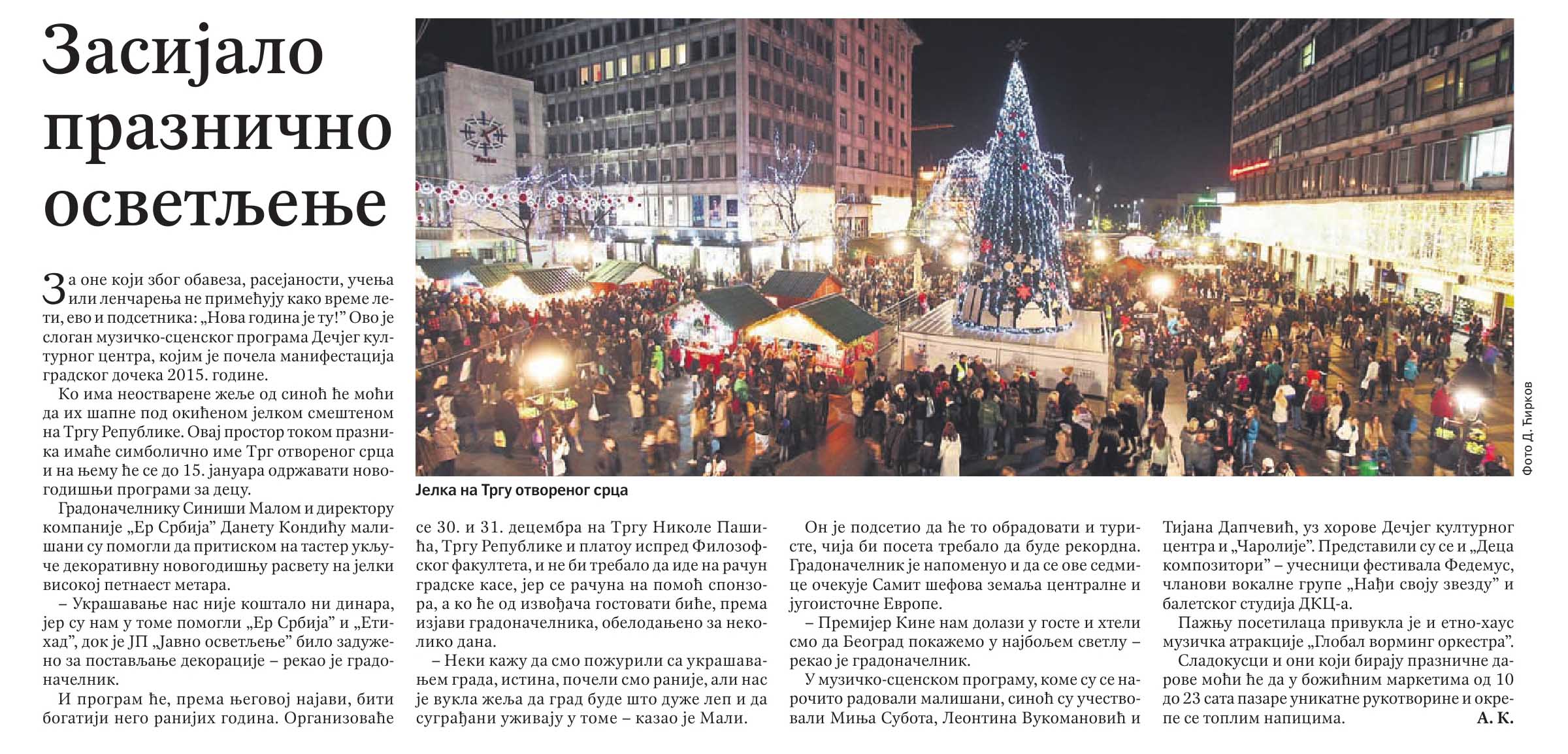 Politika – Zasijalo praznično osvetljenje Posted on 16/12/201416/12/2014 Za one koji zbog obaveza, rasejanosti, učenja ili lenčarenja ne primećuju kako vreme leti, evo i podsetnika: Nova godina je tu! Ovo je slogan Dečjeg kulturnog centra, kojim je počela manifestacija gradskog dočeka 2015. godine. Posted in Press Clipping and tagged dkcb, nova godina, novogodišnji program, politika.