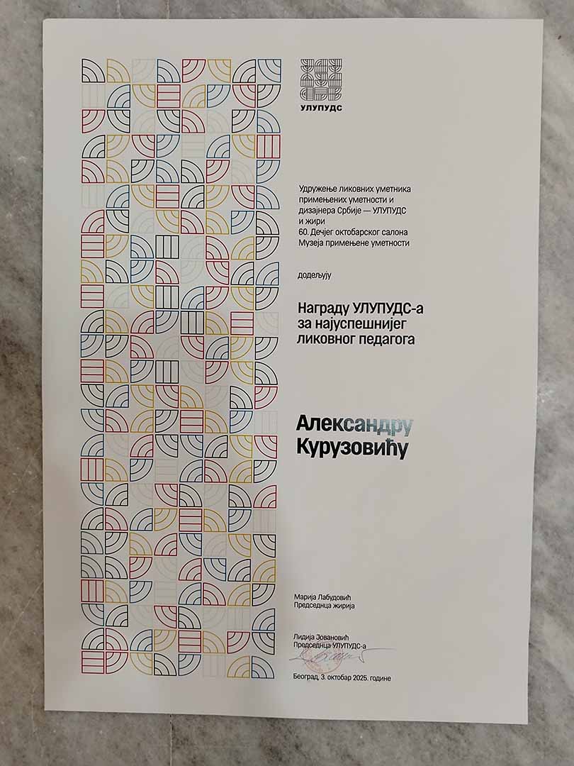 Награду УЛУПУДС-а за најуспешнијег ликовног педагога – Александру Курузовићу.
