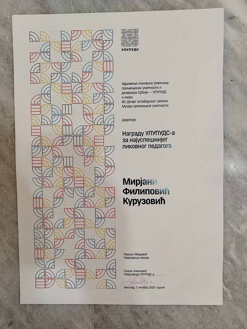 Награду УЛУПУДС-а за најуспешнијег ликовног педагога – Мирјани Филиповић Курузовић.