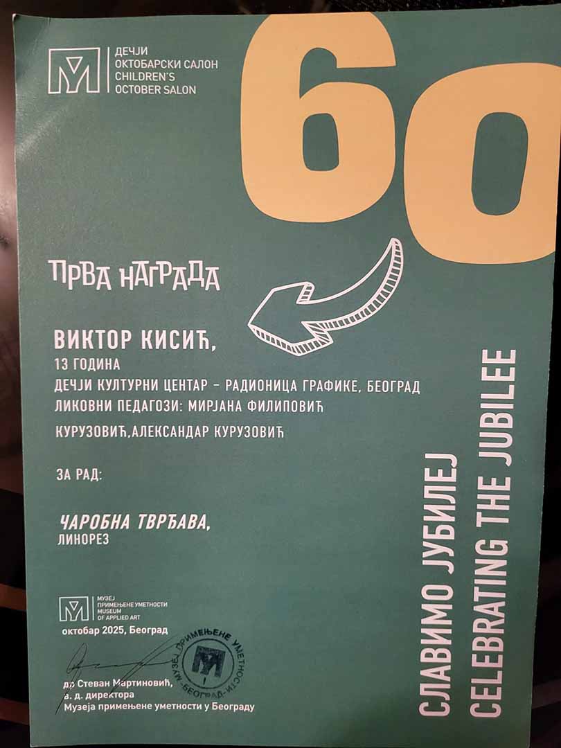 Са задовољством обавештавамо да је полазник Радионице графике ДКЦБ, Виктор Кисић освојио I награду на 60. Дечјем октобарском салону Музеја примењене уметности за графички лист ”Чаробна тврђава” рађен техником линорез.