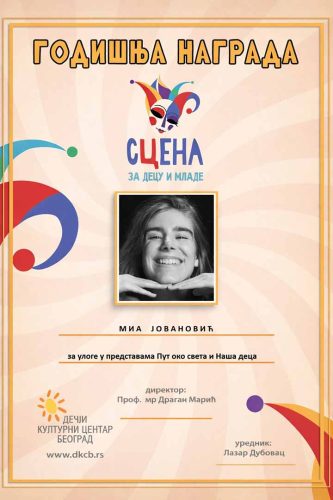 – за више улога у представама Пут око света и Наша деца – Миа Јовановић