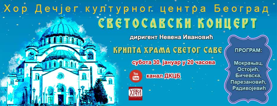 Хор Дечјег културног центра Београд одржаће Светосавски концерт у Крипти Храма Светог Саве, у суботу 30. јануара, у 20 часова. Под диригентском палицом мр Невене Ивановић, чланови дечјег хора показаће своју даровитост и музикалност изводећи композиције Мокрањца, Радивојевића, Парезановића, Бичевске, Остојића, као и светосавске и божићне традиционалне песме.