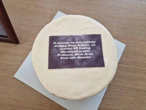 Поводом Фестивала ,,Миња Субота”, који се одржава на дан рођења чувеног певача, композитора и ТВ аутора, у просторије Дечјег културног центра Београд стигла је торта од деце из ОШ ,,Доситеј Обрадовић” из Новог Брда, села Прековце, са Косова!