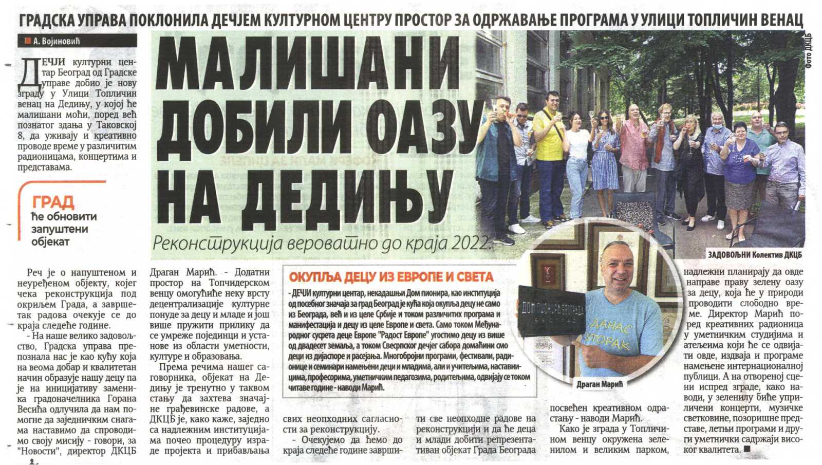 Градска управа поклонила Дечјем културном центру простор за одржавање програма у Улици Топличин венац. Цела вест доступна на линку.