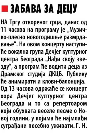 Večernje novosti – Zabava za decu Posted on 24/12/201424/12/2014 VEČERNJE NOVOSTI – Beograd Datum: Ned, 21/12/2014 Posted in Press Clipping and tagged dkcb, novogodišnje razmrdavanje, večernje novosti.