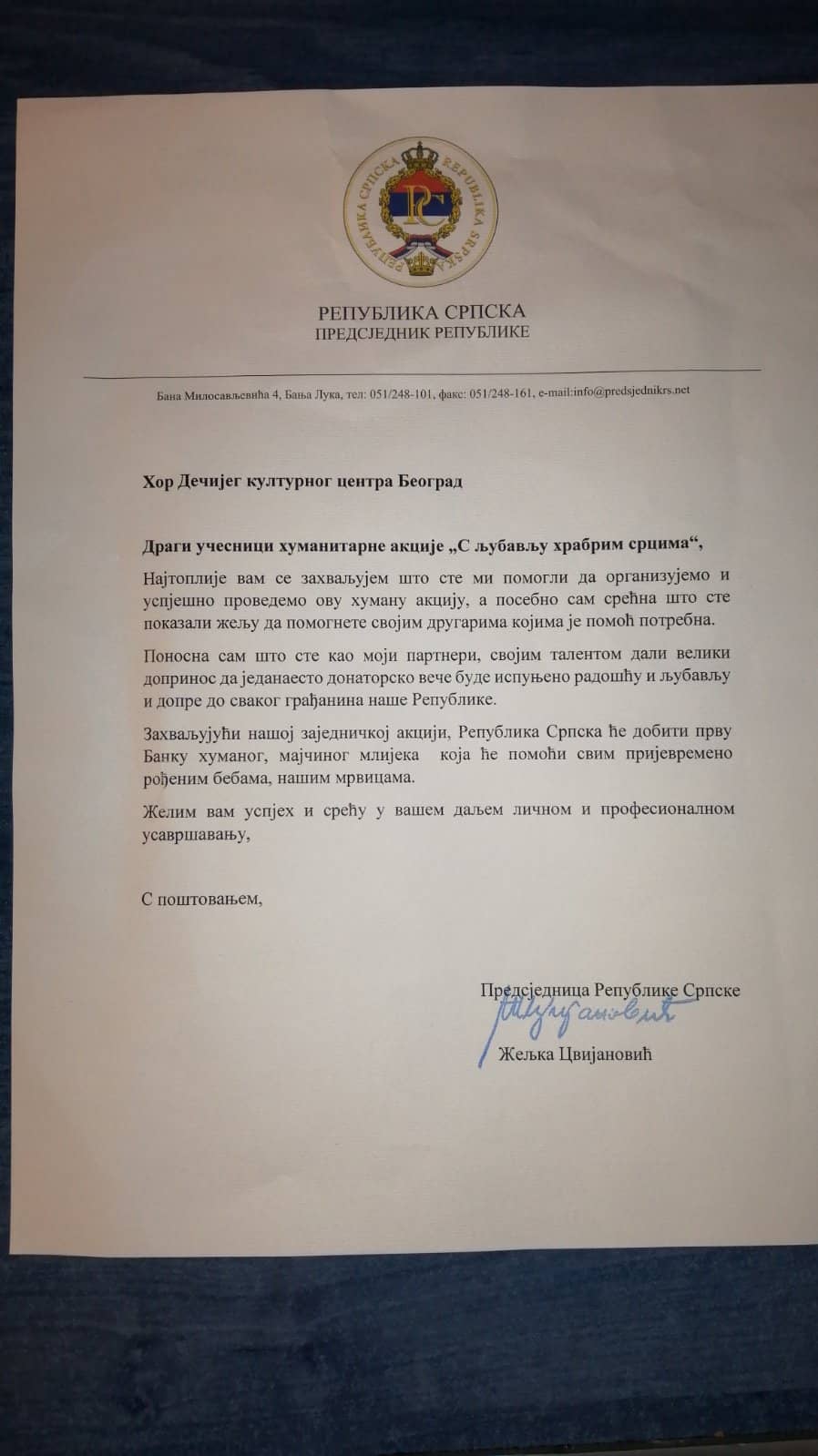 Захвалница председнице Републике Српске Жељке Цвијановић Хору Дечјег културног центра Београд, за учествовање у хуманитарној акцији за прикупљање средстава за прву Банку хуманог млека у Републици Српској – С ЉУБАВЉУ ХРАБРИМ СРЦИМА.