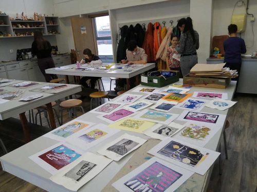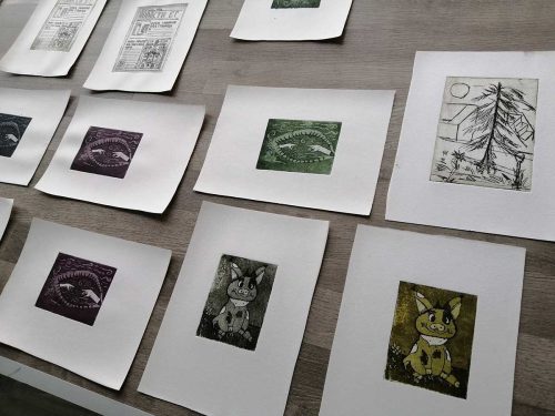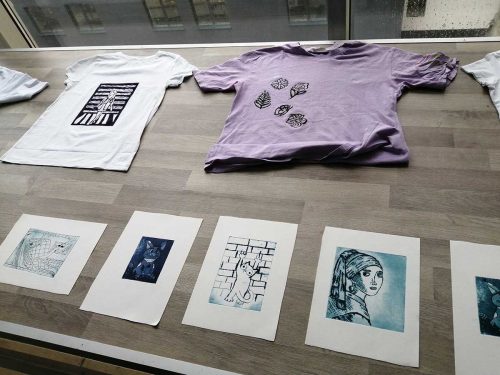 Отисци на мајцама и неке од графика насталих у бесплатној Радионици графике ДКЦБ (9. – 19. јануар 2023.)